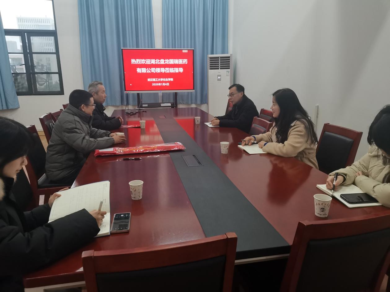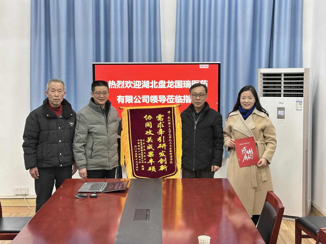 2026年1月4日,湖北盘龙国瑞医药有限公司董事长周才华、总经理夏赋文一行莅临化生学院,向学院赠送锦旗与感谢信,并与学院师生代表座谈交流。座谈会由学院党委书记韩同远主持。